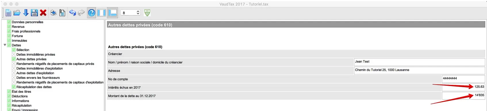 Dans la section « Dette », complétez les informations demandées par le logiciel dans l’onglet « Autres dettes privées ». Voici une capture d’écran qui vous montre un exemple concret de déclaration.